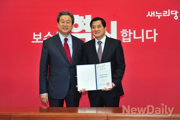 새누리당 김무성 대표가 11일 오전 서울 여의도 국회 새누리당 대표실에서 열린 홍보위원회 임명장 수여식에서 박대출 의원에게 임명장을 수여하고 있다.