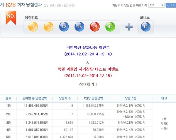 2014년 12월 13일 실시된 제628회 나눔로또 1등 당첨번호는 '1, 7, 12, 15, 23, 42'이며, 2등 보너스 번호는 11번이다.이번 로또 628회차 추첨 결과 1등 당첨자는 9명으로 14억9994만2875원의 당첨금을 받게 됐다.1등 번호 중개와 보너스 번호를 맞힌 2등은 37명이며, 1인당 6080만8495원씩 지급받는다. 당첨번호 중 5개를 맞힌 3등은 1628명으로 당첨금은 각 138만2012원이다.5만원의 당첨금을 받는 4개의 번호를 맞힌 4등은 8만147명이며, 5000원의 고정 당첨금을 받는 5등은 132만3978명이 나온 것으로 집계됐다.한편, 이번주 로또628 총 판매금액은 572억5310만9000원이다.[로또628회당첨번호, 사진=로또 홈페이지 캡처]