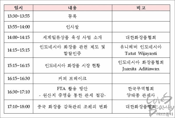 <대한화장품협회(회장 서경배)>가 화장품 관련 담당자를 대상으로 오는 12월 22일 오후 1시 30분부터 6시까지 코엑스 3층 E4홀에서 [인도네시아 및 중국 수출 증진을 통한 차세대 세계일류 기업 및 상품 육성 방안 세미나]를 개최한다.이번 세미나는 성장 잠재력이 큰 인도네시아와 중국 화장품 시장에 대한 수출 증진을 통한 차세대 세계일류 기업 및 상품 육성을 위해 개최된다.△세계일류상품 육성사업 소개(대한화장품협회) △인도네시아 화장품 관련 제도 및 할랄인증 절차와 방법(유니레버 인도네시아; Tutut Wijayanti) △인도네시아 화장품시장 현황(인도네시아 화장품협회; Juanita Aditiawan) △FTA 활용방안-원산지 증명을 통한 관세절감(한국무역협회 양태종 관세사)에 대한 주제발표와 더불어 △중국 화장품 감독관리 조례의 변화(대한화장품협회)에 대한 설명이 있을 예정이다.