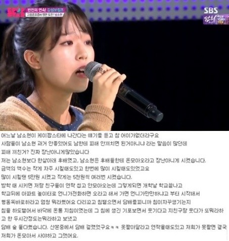 해당 글을 게재한 이 네티즌은 자신을 남소현의 초 중학교 1년 후배라고 소개하며 남소현에게 괴롭힘을 당했다고 주장했다. 그는 "남소현이 'K팝스타'에 나간다는 이야기를 듣고 참 어이가 없더라"고 말문을 열었다.