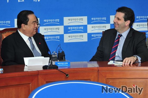 문희상 새정치민주연합 바상대책위원장이 16일 서울 여의도 국회 당대표실에서 [마크 리퍼트(Mark William Lippert)] 주한 미국대사를 접견하고 있다.