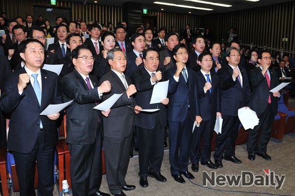 새정치민주연합 문희상 비상대책위원장과 우윤근 원내대표를 비롯한 소속 의원들이 17일 오전 서울 여의도 국회에서 열린 새정치민주연합 비선실세 국정농단.청와대 외압 규탄 비상 의원총회에서 구호를 하고 있다.