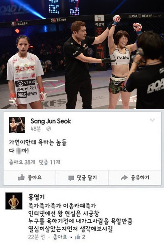 이에 송가연과 같은 팀 코치이자 종합격투기 선수인 석상준 코치는 16일 자신의 페이스북에 "가연이한테 욕하는 놈들 다 X까"라는 막말을 게재했다. 홍영기 선수 역시 이날 페이스북에 "족가족가족가 이종카페족가"라는 욕설을 연상시키는 단어를 쓰며 이종격투기 카페를 비난해 논란을 키웠다.