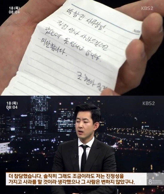 '땅콩 회항' 사건의 피해자 박창진 대한항공 사무장이 조현아 전 부사장의 사과쪽지를 공개했다.조현아 전 부사장은 지난 14일 박 사무장의 자택을 찾아 수첩을 찢은 종이에 직접 만나 사과하고 싶다는 내용의 첫 번째 쪽지를 남겼다.이에 박창진 사무장은 지난 17일 KBS 1TV '뉴스라인'에 출연해 조 전 부사장의 사과쪽지를 공개하며 진정성이 느껴지지 않는다고 일침을 가했다. 사과쪽지에는 '직접 만나 사과드리려고 했는데 못 만나고 갑니다. 미안합니다'라고 적혀 있다.하지만 박 사무장은 조현아 사과쪽지에 대해 "솔직히 그래도 조금이라도 저는 진정성을 가지고 사과를 할 것이라고 생각했다. 더 참담했다"며 "진정성을 가지고 사과할 것이라고 생각했으나 전혀 준비돈 사과가 아니었다. 한줄 한줄에 저를 배려하는 진정성은 없었다. 그 사람은 변하지 않는다"고 밝혔다.또한, 박창진 사무장은 대한항공 측의 조직적인 증거 인멸 시도가 있었다고 폭로했다. 그는 이번 이번 사건에 대한 사실관계 확인서를 약 10~12회 정도 수정했으며, 회사 측이 사건을 최초로 보고한 e메일을 삭제하라고 명령했다고 털어놨다.한편, 조현아 전 부사장은 '램프 리턴'으로 항공보안법 등을 위반한 혐의를 받고 있다. 이에 지난 17일 오후 피의자 신분으로 검찰에 출두해 12시간 가량 강도 높은 조사를 받았으며, 18일 새벽 2시15분쯤 귀가했다. 조현아 사과쪽지[조현아 사과쪽지, 사진=KBS 뉴스 보도 캡처]