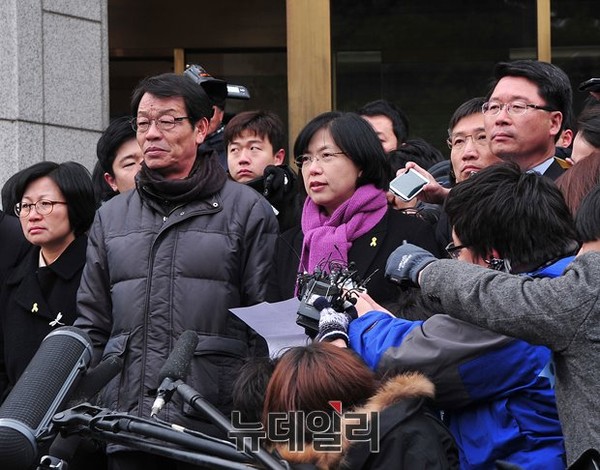 19일 오전 서울 종로구 헌법재판소에서 해산 결정 후 이정희 대표가 기자회견을 가지고 있다. 이날 헌법재판소는 통합진보당 해산심판청구 선고에서 헌법재판관 9명 중 8명의 찬성 의견으로 통합진보당의 해산을 결정했다.