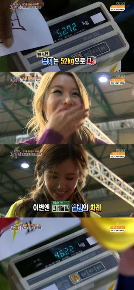 걸그룹 크레용팝 엘린과 베스티 유지의 몸무게가 강제 공개됐다.21일 오전 방송된 KBS 2TV '출발드림팀 시즌2' 걸그룹 천하장사 편에서는 걸그룹 멤버들의 씨름 대결이 벌어졌다.이날 예선전에서 만난 크레용팝 엘린과 베스티 유지는 치열한 접전 끝에 동점을 기록했다. 이에 두 사람 중 체중이 적게 나가는 사람이 준결승전에 진출하게 됐다.이에 유지와 엘린은 체중계 위에 섰고, 이 과정에서 두 사람의 몸무게가 공개돼 눈길을 끌었다. 키가 큰 유지는 52.72kg로 자신의 몸무게가 노출되자 얼굴을 가리며 민망함을 감추지 못했다.반면에 키가 작고 아담한 크레용팝 엘린은 몸무게가 46.22kg였다. 결국 몸무게가 덜 나간 크레용팝 엘린이 준결승전에 진출했다.[엘린 유지 몸무게 공개, 사진=KBS2 '출발드림팀2' 방송 캡처]