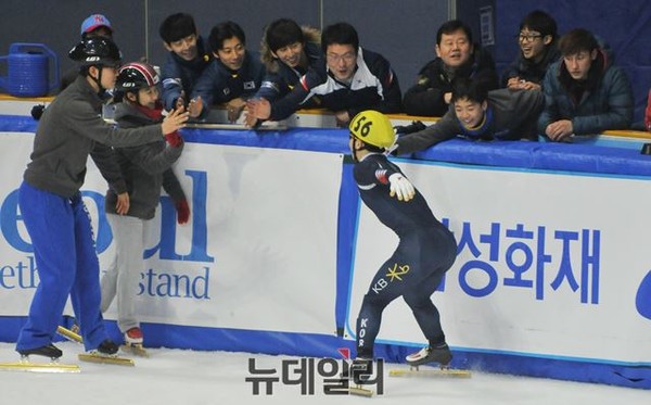 쇼트트랙 국가대표 서이라 선수가 21일 서울 목동 아이스링크에서 열린 [2014-2015 국제빙상경기연맹(ISU) 쇼트트랙 월드컵 4차대회] 남자 500m 결승전을 통과 후 팀원들과 하이파이브를 하고 있다.