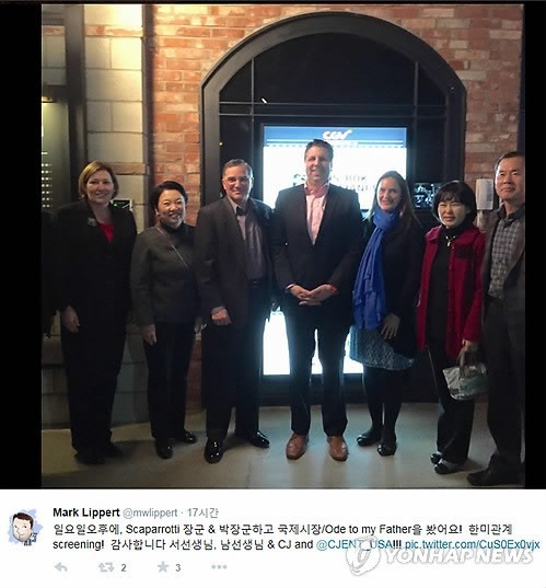네이비 실 출신으로 알려진 리퍼트 대사는 이날 오후 스캐퍼로티(Scaparrotti) 한미연합사령관, 박선우 한미연합사 부사령관과 함께 모 극장에서 '국제시장'을 관람한 뒤 자신의 트위터에 인증샷을 올렸다.일요일 오후에 Scaparrotti 장군 & 박장군하고 국제시장(Ode to my Father)을 봤어요! 한미관계 screening! 감사합니다. 서선생님, 남선생님 & CJ and @ CJENT_USA!!!