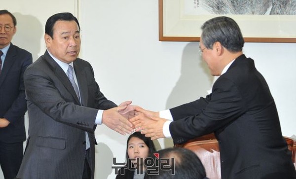 이완구-우윤근 여야 원내대표 등 지도부가 23일 오전 서울 여의도 국회 운영위원회실에서 주례회동을 갖고 있다.