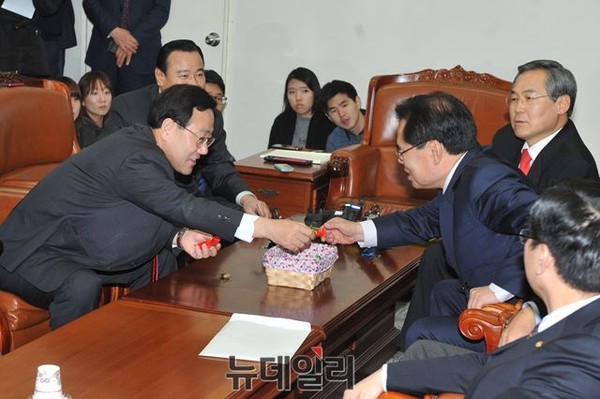 주호영 새누리당 정책위의장이 23일 오전 서울 여의도 국회 운영위원회실에서 주례회동에서 야당 의원들에게 사탕을 나눠 주고 있다.