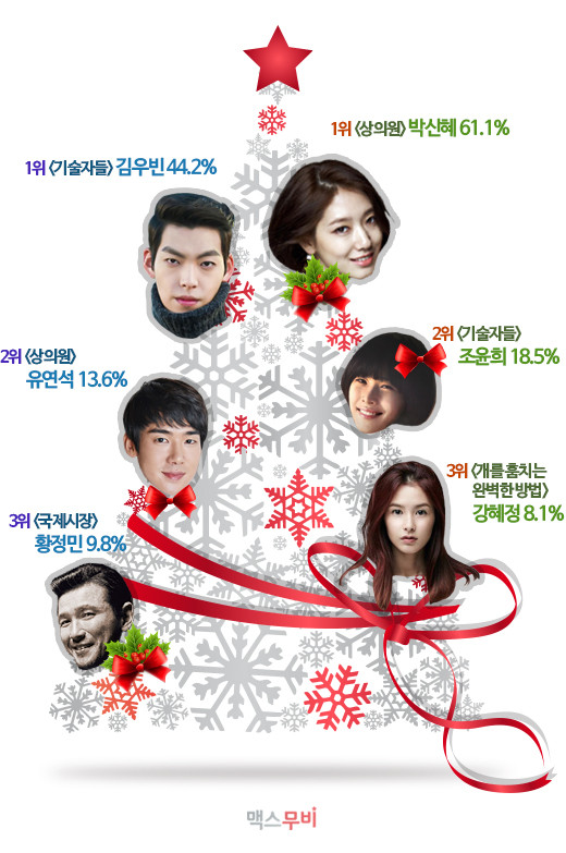관객들이 꼽은 2014년 크리스마스에 같이 보내고 싶은 배우 1위는 '상의원'의 박신혜와 '기술자들'의 김우빈이다. 영화와 드라마를 오가며 젊은 관객들에게 폭 넓은 사랑을 받고 있는 배우들이다. 뒤를 이어 2위를 차지한 '기술자들'의 조윤희와 '상의원'의 유연석 역시 크리스마스 시즌 개봉 예정작의 주인공으로서 독자들의 기대를 한몸에 받고 있는 배우들이라는 공통점이 있다. 3위는 '개를 훔치는 완벽한 방법'의 강혜정과 '국제시장'의 황정민이 차지했다.