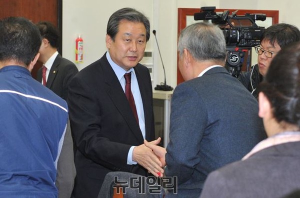 김무성 새누리당 대표가 26일 오후 서울 여의도 국회에서 열린 공적연금강화를 위한 공동투쟁본부 간담회에 관계자들과 인사를 나누고 있다.