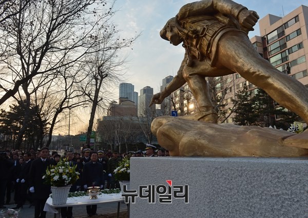 故 한주호 준위의 동상 제막식이 27일 오후 서울 강남구 수도전기공고 강당에서 해군사령부와 천안함재단 관계자, 천안함 유가족, 수도전기공고 동문 등이 참석한 가운데 진행됐다.