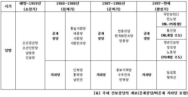 대한민국의 역대 진보정당은 크게 ▲초창기(해방~1959년) ▲침체기(1960~1986년) ▲준비기(1987년~1996년) ▲활성기(1997년~현재)로 구분되며, 활동 형태상으로는 ‘공개’(합법 정당) 조직과 ‘비공개’(비합법 정당) 조직으로 나누어져 이중적 구조를 띄어왔다.