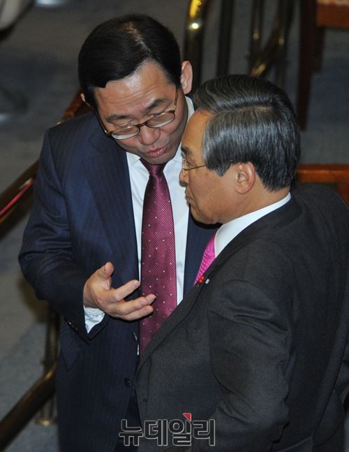 우윤근 새정치민주연합 원내대표와 주호영 새누리당 정책위의장이 29일 오후 서울 여의도 국회에서 열린 본회의에서 대화를 나누고 있다.
