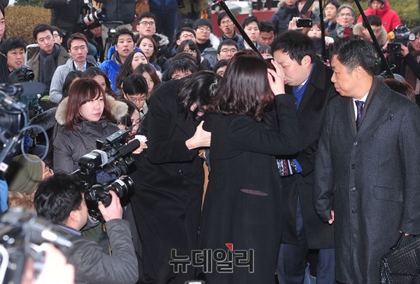 취재진들이 조현아 전 부사장의 양팔을 부여잡고 계속해서 질문했지만 조 전 부사장은 검찰 관계자의 팔에 매달리다시피 붙어 온몸을 바들바들 떨면서 고개를 푹 숙였다.