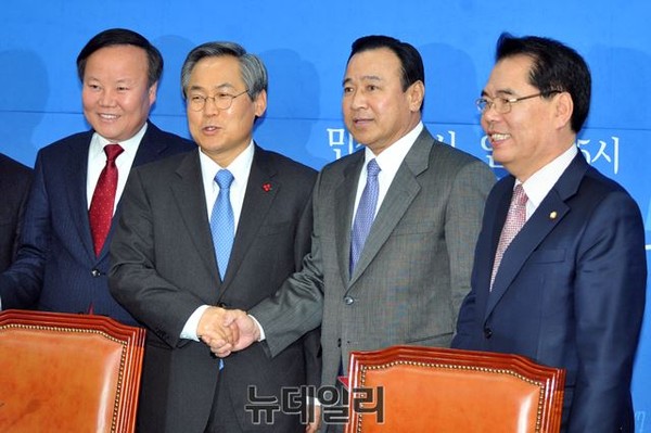 이완구 새누리당 원내대표와 우윤근 새정치민주연합 원내대표 및 여야 원내지도부가 6일 오전 서울 여의도 국회 새정치민주연합 원내대표실에서 열린 주례회동에서 기념사진을 촬영하고 있다.