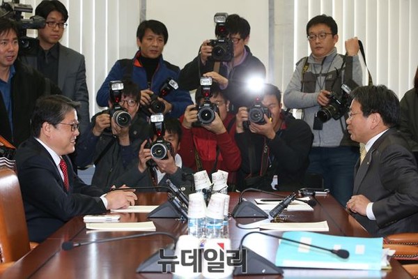 국민대타협기구 공동위원장 조원진 새누리당 의원과 강기정 새정치민주연합 의원이 6일 오후 서울 여의도 국회 안전행정위원회 소회의실에서 회의을 갖고 있다.
