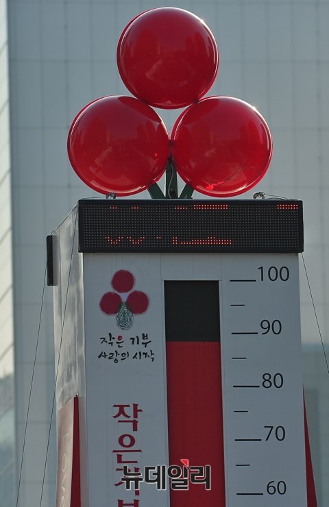 서울 광화문광장에 세워진 사랑의온도탑이 9일 오후 88.2도를 가르키고 있다. 사랑의온도탑은 성금이 목표액(3,268억 7,700만원) 대비 1% 올라갈 때마다 온도계가 1도씩 상승해 목표액을 달성하면 100도가 된다.