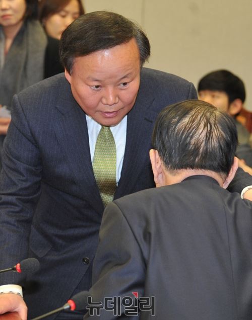 청와대 민정수석이 사의를 표명한 가운데 9일 오후 서울 여의도 국회 운영위 회의실에서 김기춘 대통려비서실장과 김재원 새누리당 원내수석부대표가 대화하고 있다.