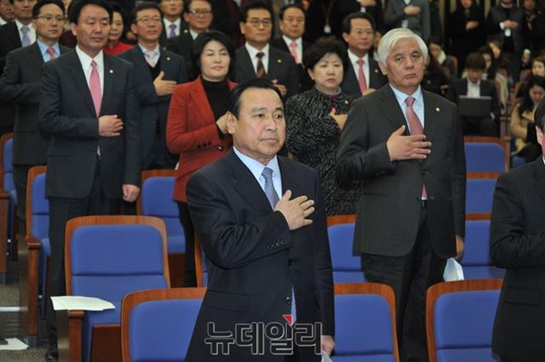 새누리당 이완구 원내대표 등 참석 의원들이 12일 오전 서울 여의도 국회에서 열린 의원총회에서 국민의례를 하고 있다.