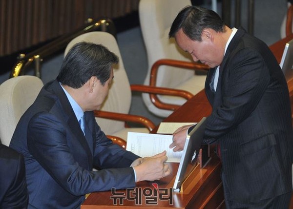 새누리당 김무성 대표가 12일 오후 서울 여의도 국회에서 열린 본회의에서 김재원 의원과 이야기를 하고 있다.