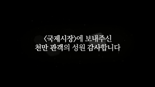 덕수의 영원한 동반자 '영자'를 연기한 김윤진은 "우리 모두의 할아버지, 할머니, 부모님께 감사한 마음을 전한 '국제시장'은 저에게도 너무 뜻 깊은 영화였다. 이렇게 많은 사랑을 받았다는 사실에 가슴이 벅차 오른다. 앞으로도 '국제시장' 많이 응원해 주셨으면 좋겠다"고 말했다.