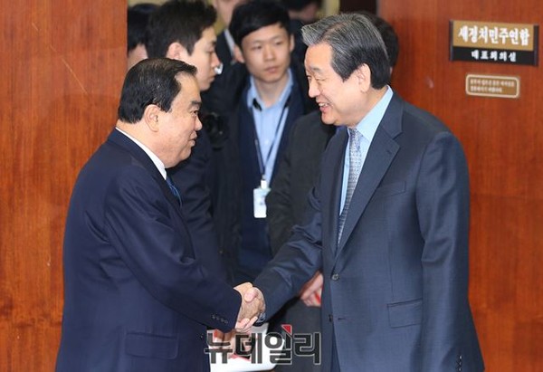 새누리당 김무성 대표와 새정치민주연합 문희상 비상대책위원장이 15일 오전 서울 여의도 국회 새정치민주연합 당대표실에서 열린 2+2여야 대표 회담에서 악수를 나누고 있다.