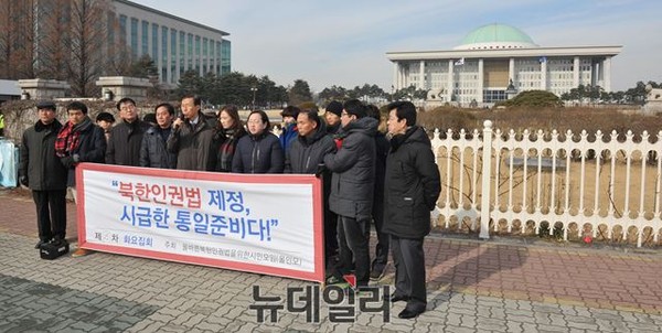 올바른 북한인권법을 위한 시민 모임(올인모) 회원들이 20일 오전 서울 여의도 국회의사당 앞에서 북한인권법 제정 운동 동참을 촉구하는 기자회견을 하고 있다.
