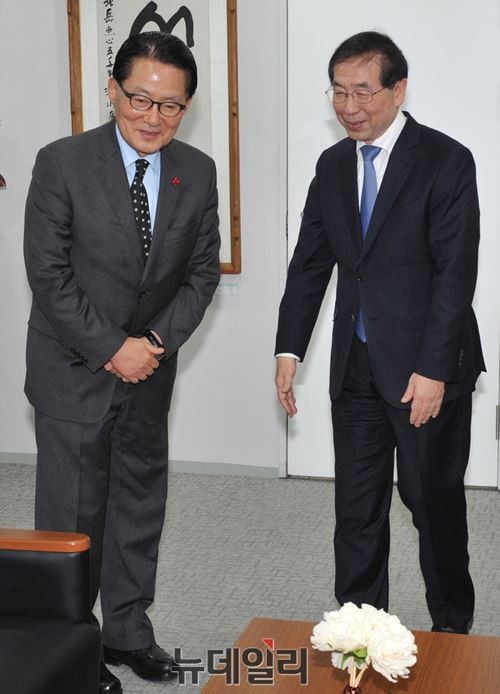박지원 새정치민주연합 당대표 후보가 21일 서울 중구 서울시청 시장실에서 박원순 서울시장과 대화를 나누고 있다.