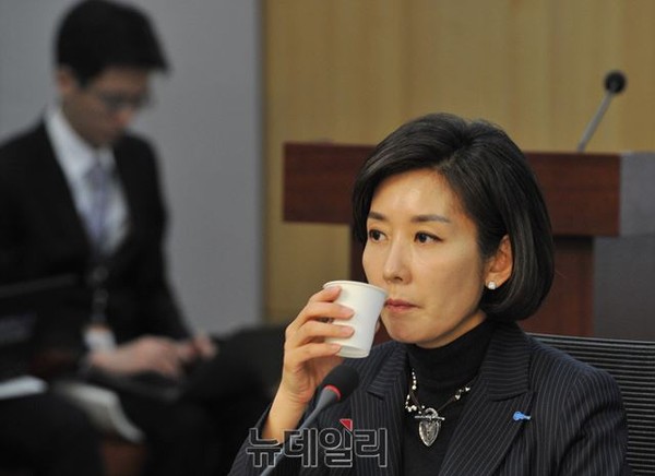 새누리당 나경원 의원이 22일 오전 서울 여의도 국회 의원회관에서 열린 여야 공동주최 오픈프라이머리 토론회에서 물을 마시고 있다.