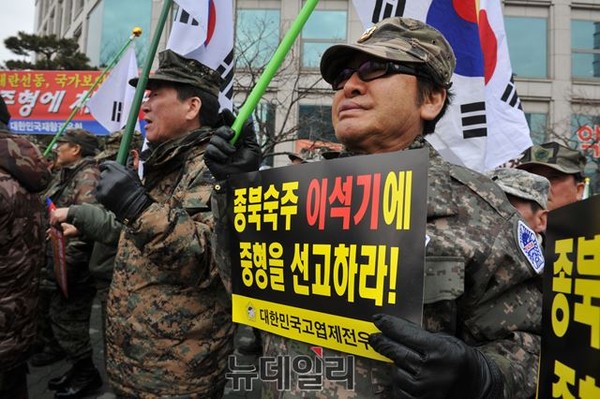 전 통합진보당 이석기의 [내란음모-선동] 사건에 대한 사법부의 최종 판단을 앞둔 22일 오후 서울 서초동 대법원 주변에서 애국보수단체 회원들이 이석기의 사형을 주장하고 있다.