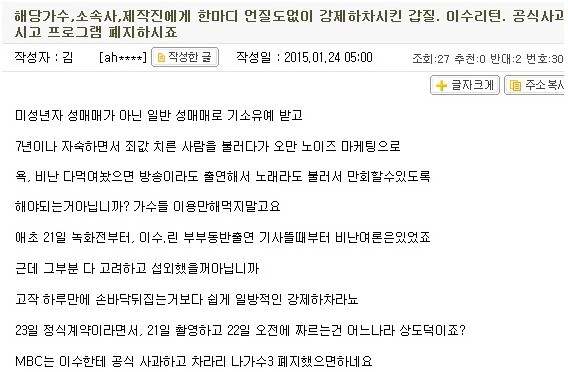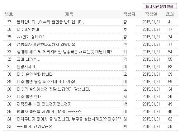 배XX라는 네티즌은 "24일 오후 1시 현재 약 2,115개에 달하는 MBC 시청자게시판 글 중, 약 1,800개의 글이 '이수 복귀'를 찬성하고, MBC에 대해 실망감을 드러내는 글"이라며 방송사 측에서 이같은 여론에 귀를 기울여 줄 것을 당부했다.현재 시청자의견의 페이지수는 141페이지. 한페이지당 15개의 글이 써져 있다. 총 약 2,115개의 글이 현재 써져있는 상태. 나가수3의 이수 섭외소식을 들은 이수안티들이 초반에 약 20페이지를 도배함. 약 300개의 글들을 써서 도배시킴. 안그런 분들도 계시겠지만 대부분 이런분들은 과거일들을 과대포장해서 소문내고다님.. 뇌구조가 이해가 안됨..이걸본 mbc 측은 이수를 강제하차시킴 ...