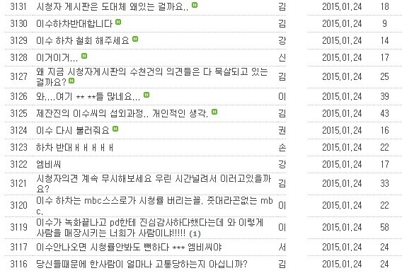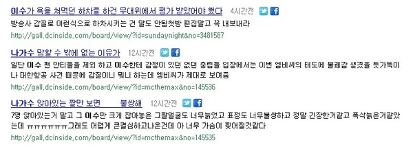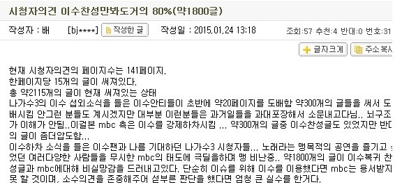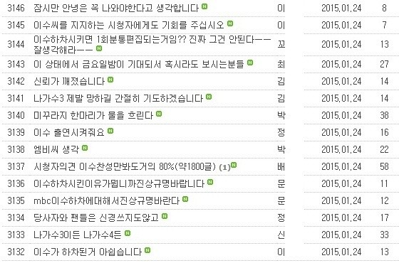 약 300개의 글 중 이수 찬성글도 있었지만 반대의 글이 좀 더 압도함...이수하차 소식을 들은 이수팬과 나름 기대하던 나가수3 시청자들... 노래라는 목적의 공연을 즐기고 싶었던 여러 다양한 사람들을 무시한 mbc의 태도에 극딜을 하며 맹 비난중.. 약 1,800개의 글이 이수복귀 찬성글과 mbc에 대해 실망감을 드러내고 있다. 단순히 이슈를 위해 이수를 이용했다면 mbc는 용서받지 못 할 것이며, 소수의견을 존중해주어 섣부른 판단을 했다면 엄청 큰 실수를 한거다.