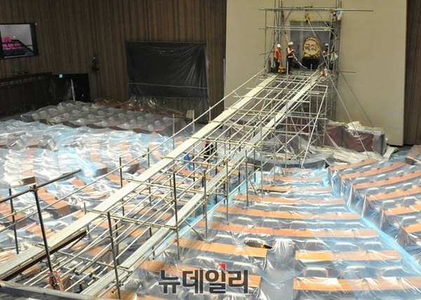 26일 오후 서울 여의도 국회 본회의장에서 공사관계자들이 본회의장 한문 상징물을 철거한 자리에 새로운 한글 상징물을 설치하고 있다.