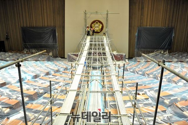 26일 오후 서울 여의도 국회 본회의장에서 공사관계자들이 본회의장 한문 상징물을 철거한 자리에 새로운 한글 상징물을 설치하고 있다.