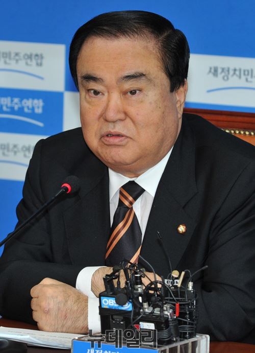 문희상 새정치민주연합 비상대책위원장이 27일 오전 서울 여의도 국회 당대표실에서 이석태 세월호 특별조사위원장과 조대환 부위원장을 비롯한 상임위원들을 만나 모두발언을 하고 있다.