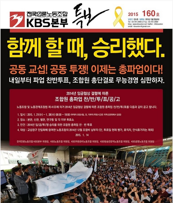 지난해 김시곤 전 보도국장의 '공개 항명'을 시발로 제작거부와 파업에 돌입, 기어코 길환영 KBS 사장의 퇴진을 이끌어낸 KBS 노조는 여세를 몰아 올해에도 '경영진과의 싸움'에서 절대 우위를 점하겠다는 각오다. 전국언론노동조합 KBS본부는 지난해 말 김서중 성공회대 교수 등이 참석한 노보 시리즈 좌담에서 "KBS노동조합과의 연대가 무엇보다 중요하다"며 "2015년 중요한 싸움을 앞두고 동지라는 인식이 필요하다"고 강조한 바 있다.