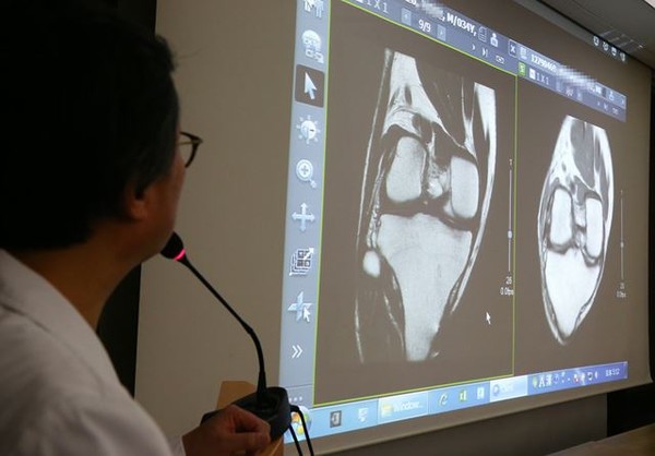29일 오후 서울 종로구 서울대학교병원에서 열린 이완구 국무총리 후보자의 차남 이모 씨 병역 관련 공개 검증에서 서울대 이명철 정형외과 교수가 MRI 사진에 대해 설명하고 있다.