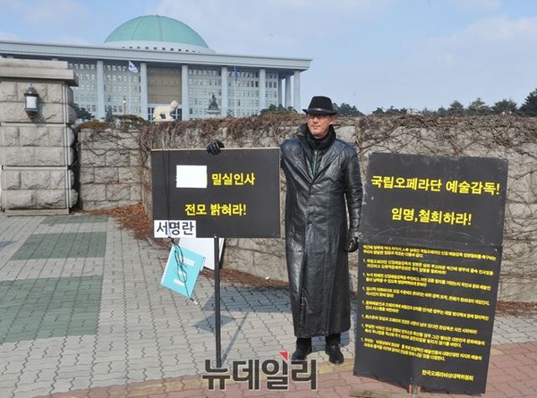 문화체육관광부가 지난 2일 공석이던 국립오페라단 신임 예술감독 자리에 소프라노 한예진을 임명하자 자질에 이의를 제기하며 반발해 1인 시위를 이어가고 있다.