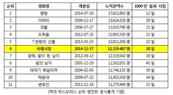 '국제시장'은 30일 오후 12시 누적 관객수 1,232만 명을 돌파하며 역대 국내 개봉 영화 중 흥행 6위에 오르는 기염을 토했다. '아바타'를 제외하면 한국 영화 흥행 톱5에 해당하는 경이적인 기록이다. 더욱 놀라운 것은 '국제시장'에 대한 흥행 열기가 아직도 가시지 않고 있다는 점이다.