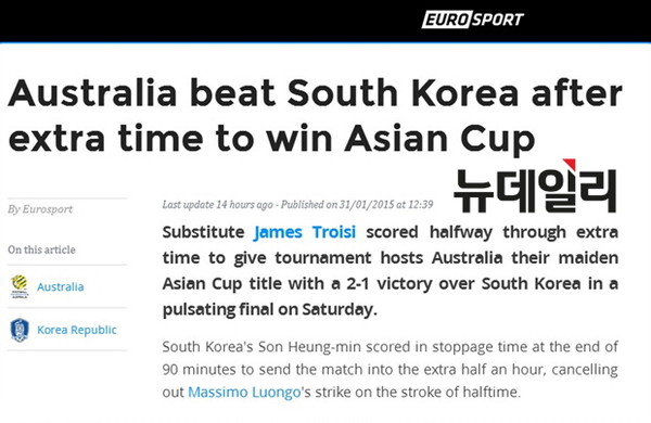 유로 스포트(EURO SPORT)는 지난달 31일 호주와의 아시안컵 결승전이 끝난 후 "한국이 2015 아시아축구연맹(AFC) 아시안컵 결승에서 호주에개 패했지만 뛰어난 경기를 펼쳤다"며 "55년만에 노린 우승은 실패했지만 27년만의 준우승에는 성공했다"고 보도했다.