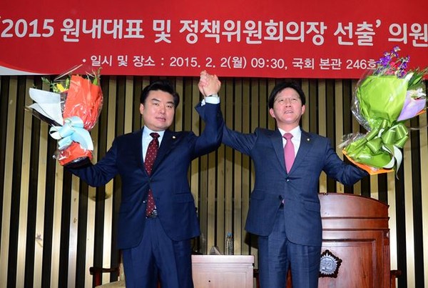 새누리당 신임 원내대표로 선출된 유승민 의원과 정책위의장 원유철 의원이 2일 서울 여의도 국회에서 열린 의원총회에서 꽃다발을 들고 있다.