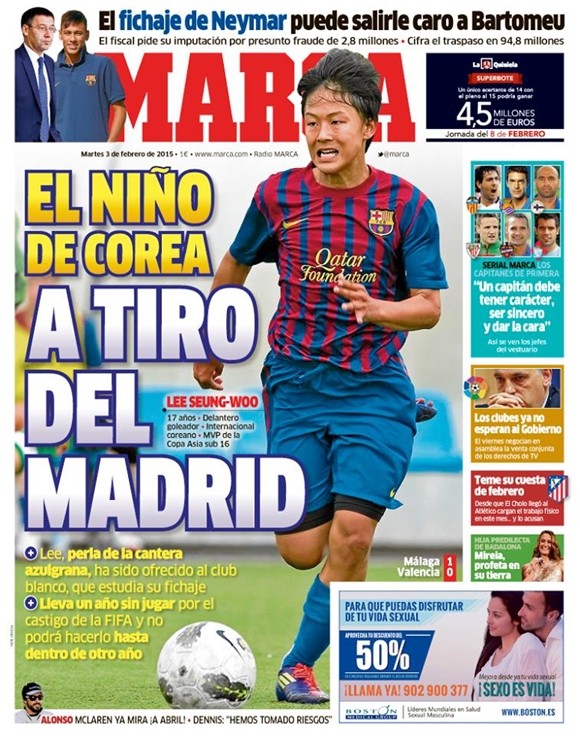 스페인 유력지 '마르카' 신문은 1면에 "한국 소년을 레알이 겨누고 있다"는 제목으로 이승우의 사진을 실었다.