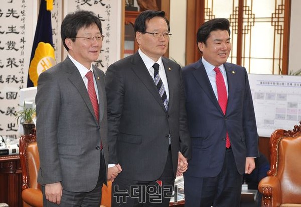 유승민 새누리당 신임 원내대표와 원유철 정책위의장이 3일 오후 서울 여의도 국회 의장실을 방문해 정의화 국회의장을 예방하고 있다.