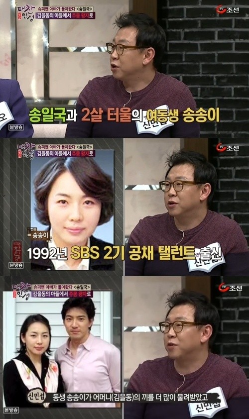송일국 동생 송송이가 주목을 받고 있다.지난 3일 방송된 TV조선 '대찬인생'에서는 최근 삼둥이 대한 민국 만세의 아빠로 다시 주목을 받으며 제 2의 전성기를 맞이한 송일국의 인생 이야기가 전파를 탔다.송일국과 2살 터울의 여동생 송송이는 1992년 SBS 2기 공채 탤런트로 데뷔해 연기를 하다가 의사와 결혼 후 현재 연예계 활동을 하지 않고 있다.이날 신민섭 기자는 "송송이가 어머니 김을동의 끼를 더 많이 물려받았다, 어린 나이에 배우로 데뷔해 연기를 하다가 요즘에는 활동을 안 하고 있다"고 전했다.이후 공개된 사진 속 송송이는 어머니 김을동과 아버지 송정웅 씨를 반반씩 닮은 단아하고 야무진 모습으로 눈길을 끌었다.[송일국 동생 송송이, 사진=TV조선 '대찬인생' 방송 캡처]