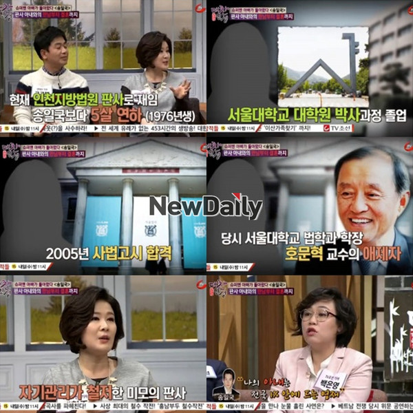 송일국 아내 정승연 판사에 대한 관심이 집중되고 있다.지난 3일 방송된 TV조선 '대찬인생'에서는 삼둥이 대한 민국 만세의 아빠로 제 2의 전성기를 맞이한 송일국의 인생 이야기가 전파를 탔다.정승연 판사는 1976년생으로 남편 송일국보다 5살 연하이다. 세화여고를 졸업하고 서울대학교 법과대학, 동대학 대학원을 졸업했으며, 2005년 사법고시에 합격했다.당시 서울대학교 법학과 학장 호문혁 교수의 애제자로 유명했던 정승연 판사는 현재 인천지방법원 판사로 재임 중이다.이날 백현주 기자는 정승연 판사에 대해 "미모의 법조인인 것은 잘 알려진 사실이다. 평소 자기관리가 철저하다"고 밝혔다.[송일국 아내 정승연 판사, 사진=TV조선 '대찬인생' 방송 캡처]