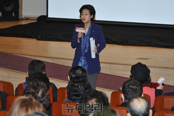 새누리당 황인자 의원이 4일 오후 서울 여의도 국회 의원회관에서 영화 '국제시장'을 무료 특별상영회에서 축사를 하고 있다.