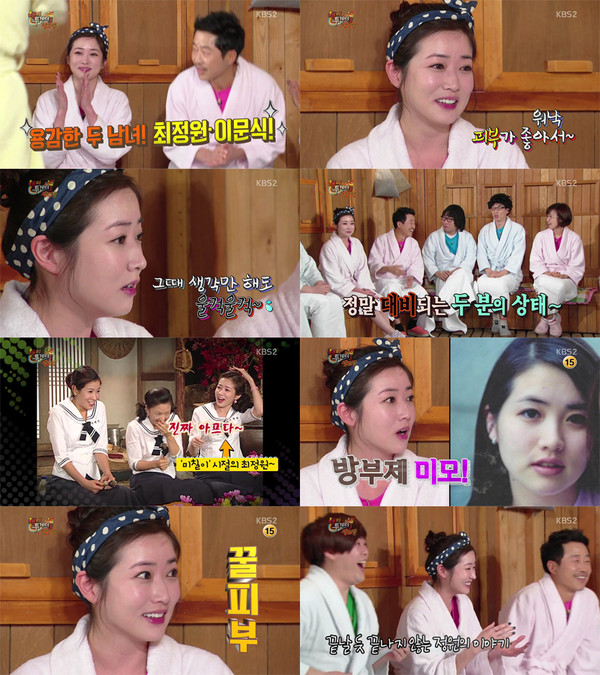 배우 최정원이 '해피투게더'에서 방부제 미모를 뽐냈다.지난 5일 방송된 KBS 2TV '해피투게더3'에서 최정원은 '해피투게더-쟁반 노래방' 이후 오래 만에 출연해 변치 않는 방부제 미모로 출연자들의 극찬을 받았다.최정원은 현재 방송 중인 KBS2 '용감한 가족'에서 캄보디아로 떠나 이문식, 박명수, 심혜진 등과 함께 현지의 가족과 같은 환경에서 생활해보는 체험을 하고 돌아왔다.이에 유재석은 한국과는 180도 다른 캄보디아의 열악한 상황에서 고생이란 고생은 모두 겪은 듯한 이문식과는 달리 전혀 고생이라는 단어와는 어울리지 않는 산뜻한 느낌의 꿀광 피부 최정원의 미모에 감탄을 금치 못했다.이날 '해피투게더'에서 최정원은 그 동안 말 주변이 없어 예능에 잘 출연하지 못했던 사연을 털어놨다. 그녀는 "그 동안 정해져 있던 이미지를 탈피해 좀 더 시청자들에게 친숙한 이미지로 다가가려고 예능에 출연하게 되었다"라고 밝혀 이목을 끌었다.한편, 최정원의 색다른 매력을 확인 할 수 있는 KBS2 '용감한 가족-캄보디아 편'은 매주 금요일 오후 11시 10분에 방송된다.['해피투게더' 최정원, 사진=KBS2 '해피투게더' 방송 캡처]