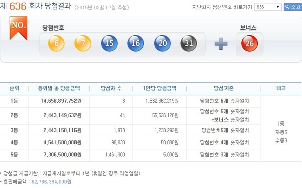 2015년 2월 7일 실시된 제636회 나눔로또 1등 당첨번호는 '6, 7, 15, 16, 20, 31'이며, 2등 보너스 번호는 26번이다.이번 로또 636회차 추첨 결과 1등 당첨자는 8명으로 18억3236만2219원의 당첨금을 받게 됐다.1등 번호 중개와 보너스 번호를 맞힌 2등은 44명이며, 1인당 5552만6128원씩 지급받는다. 당첨번호 중 5개를 맞힌 3등은 1973명으로 당첨금은 각 123만8292원이다.5만원의 당첨금을 받는 4개의 번호를 맞힌 4등은 9만830명이며, 5000원의 고정 당첨금을 받는 5등은 146만1300명이 나온 것으로 집계됐다.한편, 이번주 로또636 총 판매금액은 627억8639만4000원이다.[로또636회당첨번호, 사진=로또 홈페이지 캡처]